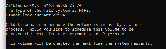• Tác dụng: Lệnh này sẽ quét ổ đĩa C: để tìm và tự động sửa chữa các lỗi hệ thống tệp. Nếu ổ đĩa C: đang được sử dụng (là ổ cài Windows), hệ thống sẽ hỏi bạn có muốn kiểm tra vào lần khởi động tiếp theo không. Nhấn Y và Enter, sau đó khởi động lại máy tính.