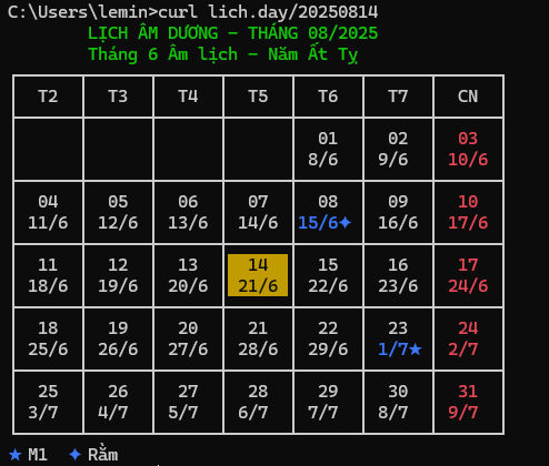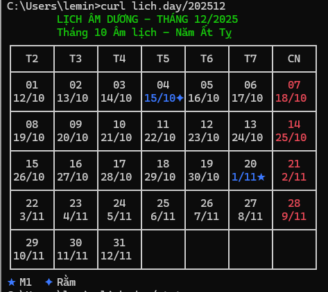 Đây là một dịch vụ web miễn phí, được thiết kế để trả về thông tin lịch âm/dương dưới dạng văn bản (text) thuần túy. Vì nó trả về text, chúng ta có thể dễ dàng “gọi” nó bằng curl – một công cụ dòng lệnh có sẵn trên hầu hết các hệ điều hành (Linux, macOS, và cả Windows 10/11) mà không cần cài đặt bất cứ phần mềm nào khác.